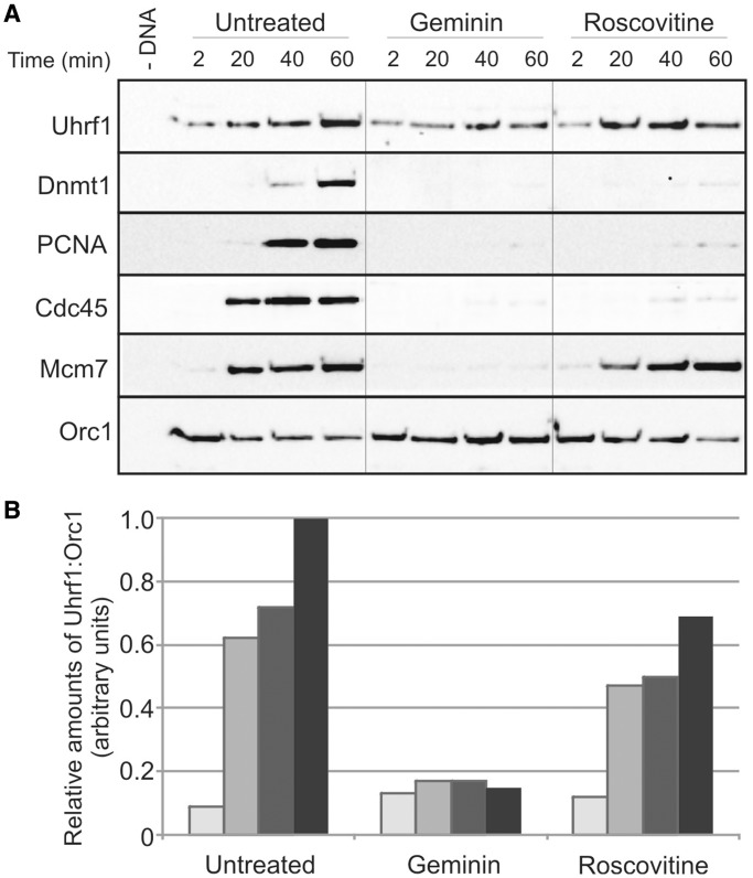 Figure 6. Uhrf1 exhibits two phases of chromatin binding. (A) XB extract containing sperm nuclei was incubated at 21°C. Replication inhibitors, geminin (80 nM) and roscovitine, were included as shown. Chromatin was isolated at the times indicated and associated proteins detected by Western blotting. Orc1 serves as a loading control. (B) A quantification of the Uhrf1 signal relative to Orc1 loading control is presented.