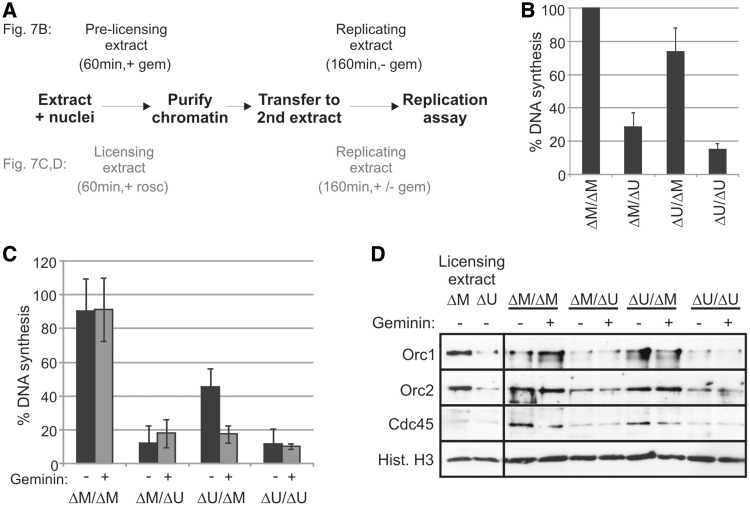 Figure 7. Uhrf1 is required before and after origin licensing. (A) A schematic representation of the experiments presented in (B) (top) and (C) (bottom). (B) Sperm nuclei were incubated for 60 min in ΔMock or ΔUhrf1 extracts containing geminin, then isolated and transferred to fresh ΔMock or ΔUhrf1 extract. DNA replication in the second extract was measured by continuous incorporation of α-32PdCTP. Data are from three independent experiments. (C) Sperm nuclei were incubated for 60 min in ΔMock or ΔUhrf1 extracts containing roscovitine before chromatin isolation and transfer to ΔMock or ΔUhrf1 extracts in either the absence or presence of geminin. DNA replication in the second extract was assayed after 160 min. Data represent three independent experiments, error bars indicate SD. (D) Chromatin from (C) was isolated after 120-min incubation in second extract and immunoblotted with the indicated antibodies. Left panel shows chromatin isolated after incubation in first extract (ΔMock or ΔUhrf1) alone.