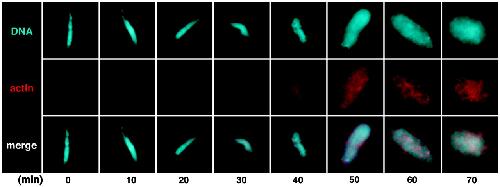 Fig. 3. Acquisition of actin during nuclear assembly in vitro. Fluorescent actin (red) was imaged as nuclei assembled in Xenopus egg extract after the addition of demembranated sperm (DNA, blue) in a representative experiment (n = 4). Diffuse actin was detected in assembling pronuclei only after 30 min. As mature nuclei assembled (50â70 min), an intranuclear actin network-like pattern became apparent.