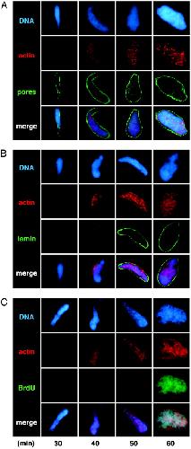Fig. 4. Acquisition of nuclear actin relative to nuclear pores, lamina formation, and DNA synthesis during nuclear assembly in vitro. Nuclei from Xenopus egg extract reactions spiked with fluorescent actin (red) were isolated at the times indicated, fixed, and probed with mAb414 against nuclear pore proteins (A, green) or antibody L046F7 against lamin (B, green). DNA synthesis was detected with anti-BrdUrd (C, green). Controls without BrdUrd had no detectable green signals. In merged images of mature nuclei, BrdUrd signals coincide with DNA (blue) as expected (aqua), and actin appears noncoincident. Diffuse actin and irregularly distributed pores are detected at 30 min, lamin epitopes at 40 min, and BrdUrd at 50 min. Assembly times vary with extract, but the relative sequence of actin acquisition, pore assembly, lamina formation, and DNA synthesis was maintained in three independent experiments.