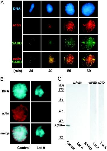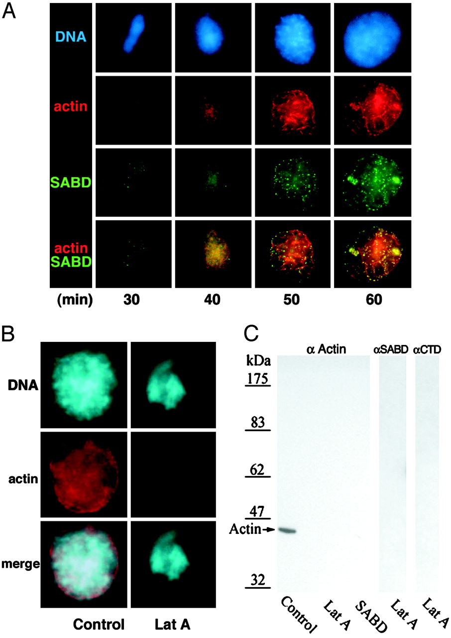 Fig. 5. Nuclear actin and 4.1. (A) Acquisition of actin relative to 4.1 SABD epitopes during nuclear assembly in vitro. Nuclei (DNA, blue) assembled in Xenopus egg extract spiked with fluorescent actin (red) were fixed and probed with anti-4.1 SABD (green). Data presented, from one of three independent experiments, used the same extract as described for Fig. 4. Diffuse actin and SABD epitopes detected at 30 min in the merge were largely coincident (yellow). At later times, coincidence of actin with 4.1 foci was apparent along with some areas of noncoincidence. (B) Latrunculin A (Lat A) inhibition of nuclear assembly in vitro (Right). Nuclei assembled in Xenopus egg extracts containing fluorescent actin (red) and 0.1 mM latrunculin A had highly aberrant chromatin morphology (94%; DNA, blue), and actin was not detected by fluorescence microscopy. (Left) A control nucleus. An equal concentration of DMSO (latrunculin vehicle) had no effect on nuclear assembly. (C) By Western blot analysis of equivalent numbers of nuclei from reactions with 0.1 mM latrunculin A or dominant negative 4.1 SABD peptides, actin was not detected, whereas it was readily detected in controls (Left). Nuclei perturbed by 0.1 mM latrunculin A also had no detectable 4.1 epitopes when probed with anti-4.1 SABD or anti-4.1 C terminus (αCTD) (Right).