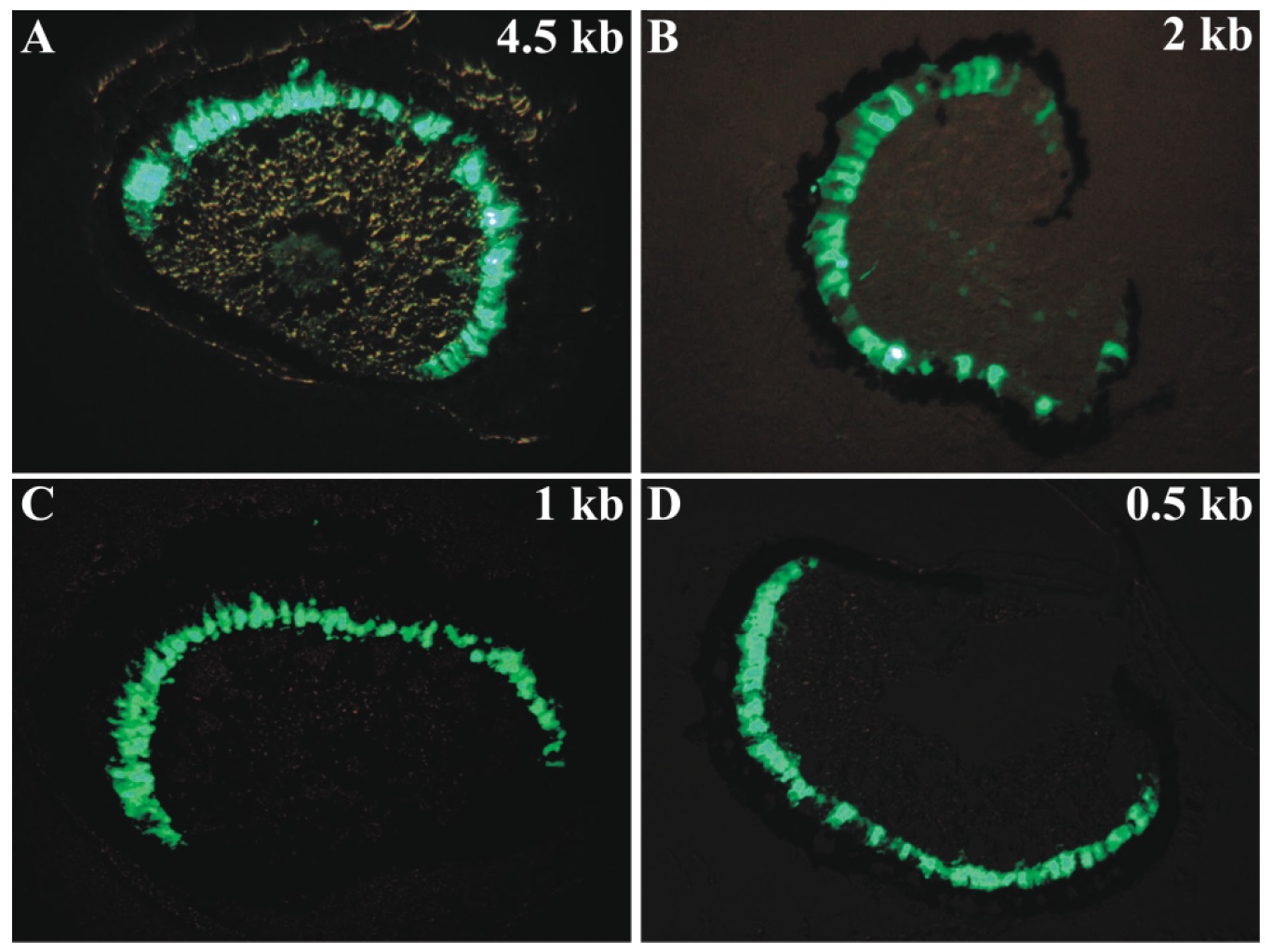 paraformaldehyde for cryo-sectioning. High-level and specific EGFP fluorescent signals were observed in eye sections of 4.5, 2, 1, and 0.5 kb promoterreporter
