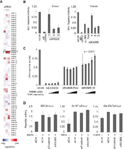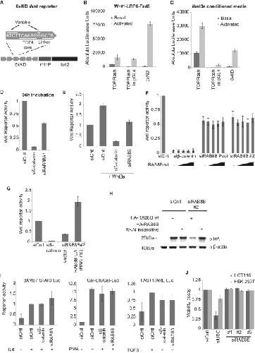 (E) RAB8B RNAi also reduced reporter activity in Wnt3a (24h) induced HeLa cells.