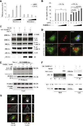 (E) RAB8B interaction with its activator RABIN8 is stimulated by adding recombinant Wnt3a (normalized to nonspecific band; RFI. relative fluorescence intensity) in HEK 293T.