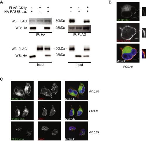 (A and B) RAB8B-c.a. coimmunoprecipitated with LRP6 activator CK1γ kinase in HEK 293T cells, and it colocalized with it in HeLa cells at the plasma membrane. Fusion proteins corresponded to sizes 25kDA (HA-RAB8B) and 50 kDa (FLAG-CK1γ), a background smear was observed originating from the light and heavy antibody chains. (C) In HeLa cells, RAB8B-w.t. and �c.a. displayed similar pattern as endogenous Caveolin-1 (CAV1) whereas RAB8B-d.n. showed a distinct punctual cytoplasmic staining. Pearson�s coefficient (PC) of colocalization was calculated by using ImageJ JACoP plugin.