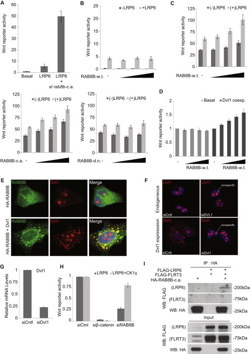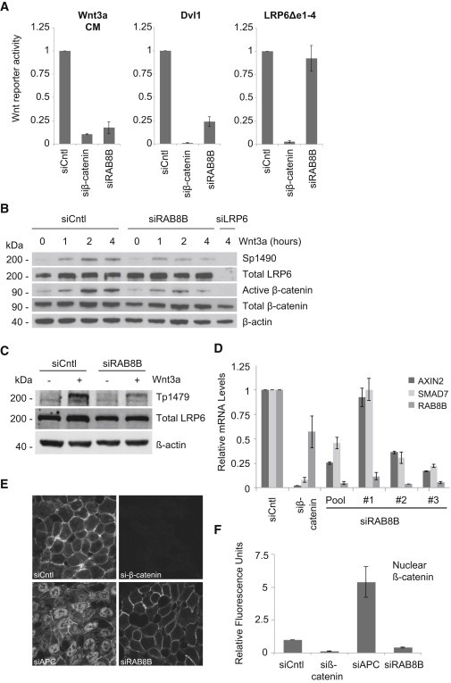 (A) RAB8B depletion reduced Wnt reporter activity when activated with Wnt3a conditioned medium (Wnt3a CM) and Dvl1 but not constitutively active LRP6Δe1-4 coexpression in HEK 293T cells.