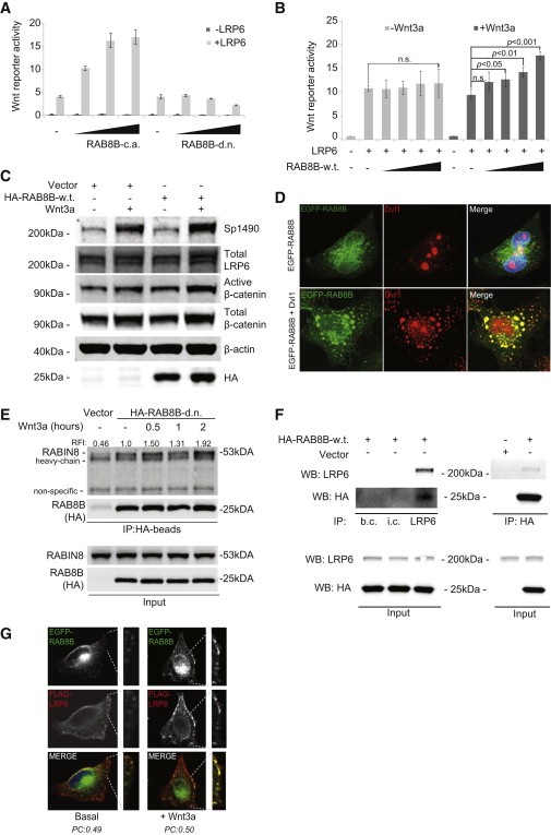 (B) In the same assay, RAB8B-WT synergized with LRP6 only in the presence of recombinant Wnt3a in HEK 293T (n.s., not significant).