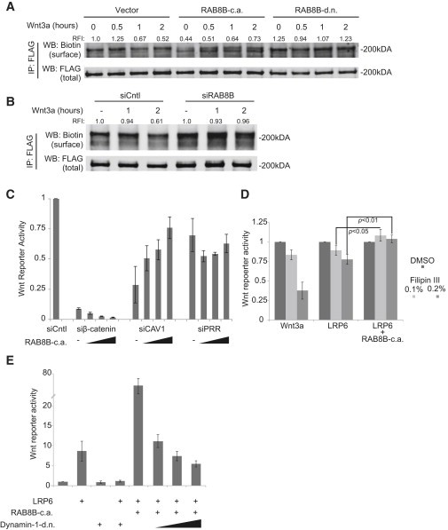 (A) RAB8B-c.a. expression reduced biotinylated FLAG-LRP6 at the plasma membrane both in the presence or absence of Wnt3a, whereas RAB8B-d.n. had the opposite effect, as quantified (normalized to FLAG) by fluorescence immunoblotting (HEK 293T).