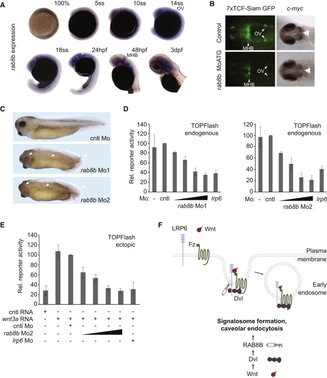 (B) Dorsal views of 30 hr postfertilization (hpf) embryos focused on the head region. Injection of rab8b ATG-morpholino into Tg(7xTCF-XLa.Siam:eGFP)ia4 transgenic zebrafish expressing GFP upon induction of the synthetic 7XTCF-Siam promoter by β-catenin, resulted in reduced GFP intensity in MHB and OV (n = 49/66), and c-myc expression in the tectum (n = 17/27).