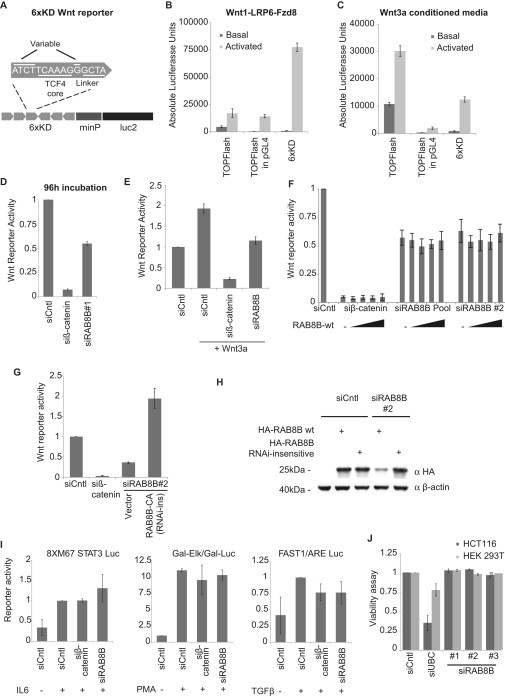Figure S1. Design and Validation of the Modified Wnt Reporter, and Further Confirmation of RAB8B RNAi Phenotype, Related to Figure 1