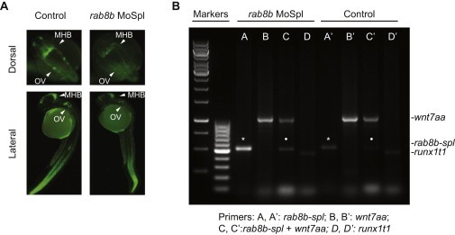 (B) RT-PCR analysis of zebrafish embryos (at 30hpf) injected with rab8b MoSpl revealed higher levels of unspliced rab8b transcript, while the amount of control transcripts, wnt7aa and runx1t1, remained unchanged.