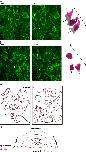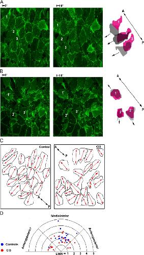 Fig. 7. Inhibition of Calpains affects the morphology and motility of mesodermal cells. Still frames from time-lapse movies of control (A) and CI3-treated (B) DMZ explants. mGFP was used as a lineage tracer. Time (t) in minutes is shown at the top left of each frame. Outlines of randomly chosen cells (1, 2, 3 in control explants and 1′, 2′, 3′ in CI3-treated explants) are shown to the right of each panel. They were drawn from the first (pink) and last (grey) frames of the movie and superimposed. Black arrows indicate the direction of migration for each cell. The black double arrow head represents the orientation of the antero-posterior (AP) axis. Cells in CI3-treated explant show alteration in morphology, orientation and motility. (C) Outlines of cells from an intermediate frame were traced and their long axes indicated with red arrows. The black double arrow head represents the orientation of the AP axis. In control explants, the cells are polarised along the medio-lateral axis. In CI3-treated explants, some cells show identical polarisation axis but the overall tissue polarity is disrupted. (D) Circular diagram of LWR versus the angle of the long axis of each of cells in A and B. Controls cells are clustered mediolaterally. Cells in CI3 treated explants are distributed randomly. Circular diagram prepared using Oriana 4.01 software.