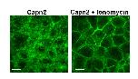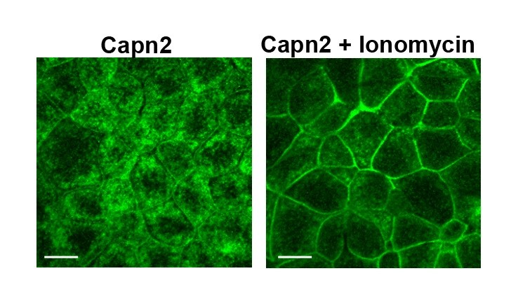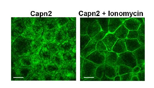 Suppl. Figure3. Calpain 2 localisation is dependent on intracellular Ca2+ concentration. Animal cap cells of stage 9 embryos injected with 400pg HA-Capn2. In embryos treated for 40 min with 10μΜ Ionomycin, Capn2 localises at the membrane whereas it is diffused in the cytoplasm in untreated embryos. Scale bar = 20μM.