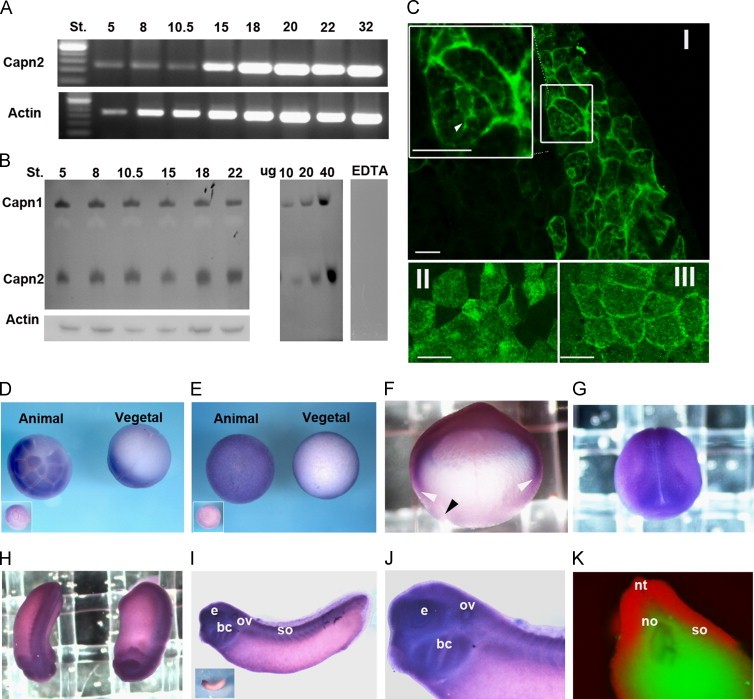 Fig. 1. Calpain2 temporal and spatial expression patterns during Xenopus development. (A) RT-PCR was performed using specific primers for Calpain2 at different stages of development. Actin was used as a loading control. (B) Casein zymography analysis was performed as described under Materials and Methods and shows the activity of Calpain1 (upper band) and Calpain2 (lower band) at different stages of development (left top gel). Western blot of actin was used as a loading control (left bottom gel). Various amounts (10�40 �g) of whole-embryo lysates were loaded on to the gel to assess the method sensitivity (middle gel). As a negative control, a gel loaded with 20 �g of lysate was incubated in a noncalcium proteolysis buffer containing 1 mM EDTA (right gel). (C) HA-Calpain2 localisation. (I) Cross-section through the dorsal mesoderm of a stage 12 embryo ectopically expressing HA-Calpain2 and stained with an anti-HA antibody. A high-magnification view of the boxed region is shown in the inset. The white arrow indicates the presumptive Golgi�ER complex. (II) HA-Calpain2 localisation in ectodermal cells of a stage 9 embryo. (III) HA-Calpain2 localisation in neural ectodermal cells of a stage 13 embryo. Scale bars=20 μΜ. (D�K) Expression pattern of Calpain2 in Xenopus by WISH. (D) Animal (left) and vegetal (right) view of a stage 5 embryo. Control hybridisation with the sense probe is shown in the inset. (E) Animal (left) and vegetal (right) view of a stage 9 embryo. Control hybridisation with the sense probe is shown in the inset. (F) Sagittal section of a stage 10.5 embryo, apical to the top, dorsal to the left. Black arrow: blastopore lip. White arrows: Mesodermal staining. (G) Dorsal view of a stage 17 embryo, anterior to the bottom. (H) Dorsal (left) and lateral (right) view of a stage 22 embryo, anterior to the bottom. (I�K) Stage 30 embryos. (I) Lateral view, anterior to the left, dorsal to the top. Control hybridisation with the sense probe is shown in the inset. (J) High magnification view of anterior region. (K) Cross-section view, dorsal to the top, of a WISH-stained tailbud embryo visualised by fluorescent microscopy (WISH-staining in red; background fluorescence in green). Abbreviations: e, eye; ov, optic vescicle; bc, branchial arches; so, somites; no, notochord; nt, neural tube.