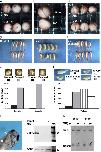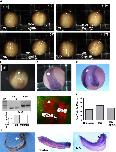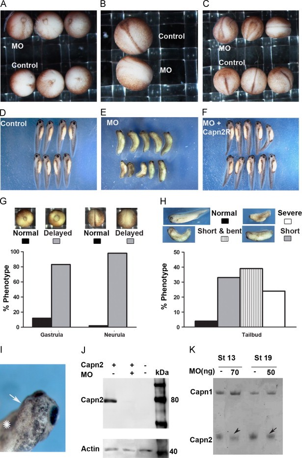 Fig. 3. Calpain2 downregulation by morpholino antisense oligonucleotide (MO) leads to mild delays in blastopore closure and severe defects during neural morphogenesis. (A) Vegetal view of stage 12.5 control embryos (bottom) and embryos injected with 70 ng MO at 1-cell stage (top). MO-injected embryos show mild delays in blastopore closure (blastopore of controls embryos=0.2�0.25 mm; blastopore of MO-injected embryos=0.35�0.5 mm). (B) Dorsal view of a stage 18 control embryo (top) and an embryo injected with 70 ng MO at 1-cell stage (bottom). The MO-injected embryo show marked delays in neural tube closure. (C) Dorsal and anterior views of stage 20 embryos injected with the MO as in B. At this stage, dorsal neural folds appear to be fused in the MO-injected embryos (top, third embryo to the right) as in controls (bottom, embryo in the middle). However, anterior neural tube is still open in MO-injected embryos (top, first and second embryos from the left) whereas it is completely closed in controls (bottom, first and third embryos). (D�F) Tailbuds of control embryos (D), embryos injected with 70 ng MO at 1-cell stage (E) and embryos in which the same amount of MO was co-injected with 500 pg Capn2R (F). MO injections cause shortening of the AP axis and head malformations (E) and this phenotype is successfully rescued by Capn2R(F). (G) Delays in blastopore closure and during neurulation are scored in embryos (injected as in A) at stage 12 and 18, respectively (n=71). Graphs indicate the percentage of embryos that display the phenotypes as depicted in the images above each graph. (H) Tailbuds of embryos injected with the MO as in A are scored for their phenotypes. They were classified in short (shorter AP axes), short and bent (shorter and dorsally curved AP axes) and severe (short and deformed embryos, completely lacking head structures). Graphs indicate the percentage of embryos that display the phenotypes as depicted in the images above each graph (n=46). (I) Dorsal view of the head of a tailbud injected with 15 ng MO at 1 out of 2 blastomeres. Loss of the eye structures (arrow) and reduced pigmentation are observed in the injected side (indicated by an asterisk). (J) Western blot analysis detecting HA-tagged Capn2 in lysates of stage 13 embryos. mRNA (200 pg) encoding HA-Capn2 is co-injected with or without MO (50 ng). This amount of MO completely blocks the translation of HA-Capn2. (K) Casein zymography analysis showing endogenous Calpain1 (top) and Calpain2 (bottom) activities in lysates of MO-injected embryos. Injection of 50 ng MO causes a 40% reduction in Calpain2 expression at stage 19 (arrow). Injection of 70 ng MO causes a 50% reduction in Calpain2 expression at stage 13 (arrowhead). Densitometry analysis was performed using ImageJ software and the samples were corrected for loading in correlation with Capn1