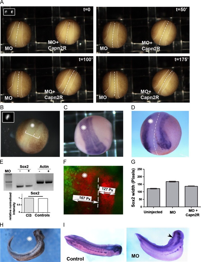 Fig. 5. Downregulation of Calpain2 by MO affects cell movements during neural tube closure. (A) Frames from a 175 min time-lapse movie of an embryo injected at 1 out of two blastomeres with 30 ng MO (left embryo in each frame) and an embryo in which the same amount of MO was co-injected with 300 pg Capn2R mRNA (right embryo in each frame). White dashed lines outline the width of the neural plate. Time (t) in minutes is shown at the top right of each frame. The injected side of the embryo is shown by FITC fluorescence in the top left inset in the first frame. The severe delay in neural plate movement caused by MO injection is successfully rescued by Capn2R. (B) Targeted injection of 20 ng MO at 1 dorsal blastomere at 4-cell stage is sufficient to cause the severe delay in neural plate movement. The injected side is visualised by FITC fluorescence (inset) and indicated by an asterisk. White lines show the width of the neural plate. (C) WISH for neural marker Sox2 in a stage 16 embryo co-injected with 20 ng MO and 50 pg mGFP at 1 dorsal blastomere at 4-cell stage. The injected side is determined as described in F and it is marked by an asterisk. Sox2 expression is wider in the MO-injected side. (D) WISH for the neural fold marker Pax3 in a stage 18 embryo injected as in C. The injected side is marked by an asterisk. Pax3 expression is shifted laterally in the MO-injected side. (E) RT-PCR analysis shows that Sox2 expression is not affected by MO-injection in XBF2-induced animal caps. Sox2 expression levels have been calculated using ImageJ and normalised against the loading control. (F) High magnification of the neural plate of a Sox2-stained embryo injected as in C and subsequently stained with an anti-GFP antibody and visualised by fluorescent microscopy. mGFP staining (green) identifies the injected side (asterisk). Sox2 staining is shown in red. The width of Sox2 staining is measured using ImageJ software. (G) Quantification of the width of Sox2 expression. The width was measured as described in F. As shown by the graph, the width of Sox2 expression is significantly wider in the MO-injected sides than in the uninjected ones. Co-injection with 250 pg Capn2R clearly rescues the phenotype (values shown are means�s.e.m., n=15). (H) Tailbud of an embryo injected with MO as in B. It presents a lateral bending towards the MO-injected side (indicated by an asterisk), probably due to decreased elongation of this side of the embryo. (I) WISH for the neural fold marker Pax3 in a stage 28 embryo injected with 40 ng MO at both dorsal blastomeres at 4-cell stage. Injection of the MO disrupts anterior neural tube closure (arrow).
