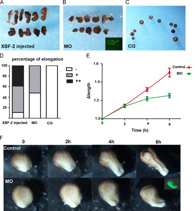 Fig. 6. Downregulation of Calpain2 expression by MO inhibits neural convergent extension. (A�C) Neural convergent extension was analysed in XBF2-injected animal caps. One-cell stage embryos were injected with 100 pg XBF2 either alone (A) or co-injected with 70 ng MO (B) or treated with 50 �M CI3 (C). The inset in B shows MO localisation in the explants as shown by FITC fluorescence. (D) Percentage of elongated explants from the experiment described in A�C. Explants with different degrees of elongation were grouped according to their length to width ratio (LWR). Black indicates a strong elongation (LWR>2), grey a mild elongation (LWR=1.2�2) and white no elongation (LWR=1�1.2). (XBF-2 injected, n=26; MO, n=23; CI3, n=24). (E�F) Neural convergent extension was analysed in neural plate explants. (F) Neural plate explants excised from stage 12�12.5 control (top panel) or MO-injected (bottom panel) embryos were left to elongate. The time (in hours) at which each picture was taken is indicated above. The inset of the last image in the bottom panel shows FITC fluorescence. (E) The graph shows the change in length (Δlength) over time in control (red) and MO-injected (green) neural explants that were prepared as in (F). The lengths were measured using ImageJ software. The plotted data are means�s.e.m (n=10). Abbreviations: LWR, length to width ratio.