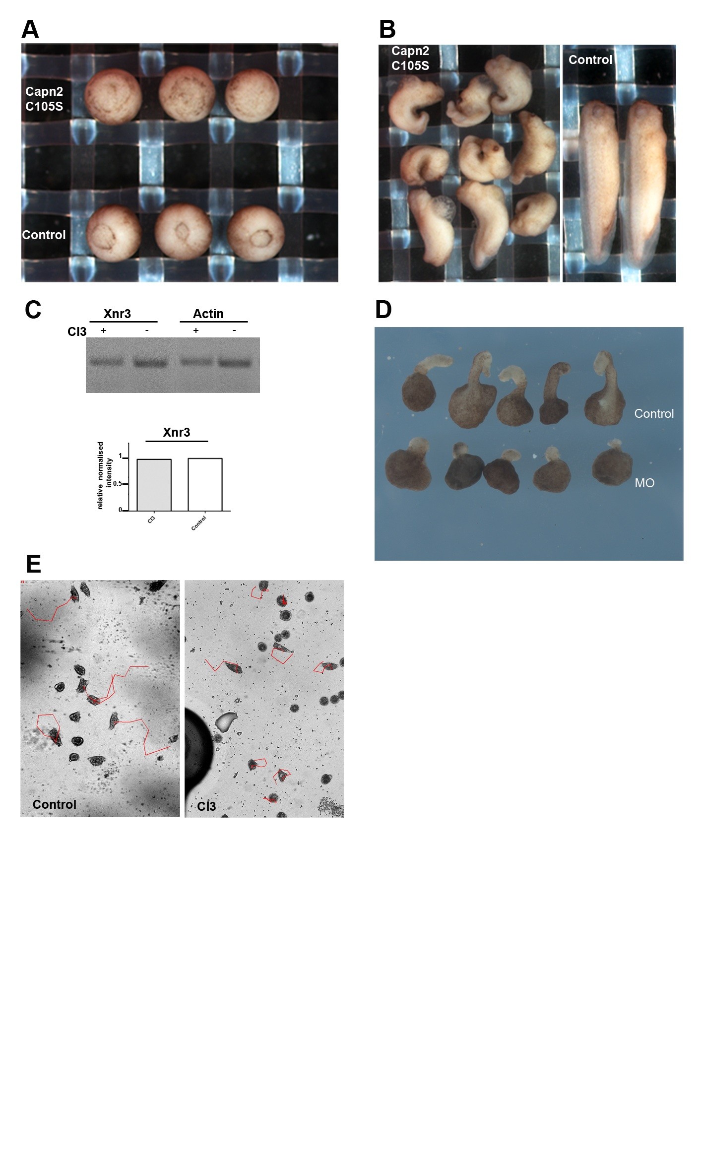 Suppl. Figure1. Inhibition of Calpain2 delays blastopore closure, blocks mesoderm convergent extension and modulates mesoderm migration, without affecting the canonical Wnt pathway. (A-B) Embryos were injected at 2 blastomeres at 2-cell stage with 1ng Capn2C105S. (A) Embryos injected with Capn2C105S show a marked delay in blastopore closure at stage 12 (top embryos) compared to controls (bottom embryos). (B) Tailbuds of embryos injected with Capn2C105S (left image) are shorter, dorsally-bent and lacking head structures. Some severe cases are spina bifida. Controls are shown to the right. (C) RT-PCR analysis shows that Xnr3 expression is not affected by CI3 treatment in stage 11 embryos. Xnr3 expression levels have been calculated using ImageJ and normalised against the loading control. (D) Injection of 70ng of Capn2 MO impairs the activin-induced elongation of animal caps explants. (E) Cell traces from Control and CI3-treated mesodermal cells derived from activin-treated dissociated caps and plated on fibronectin-coated coverslip.