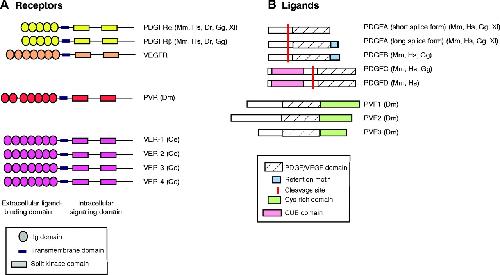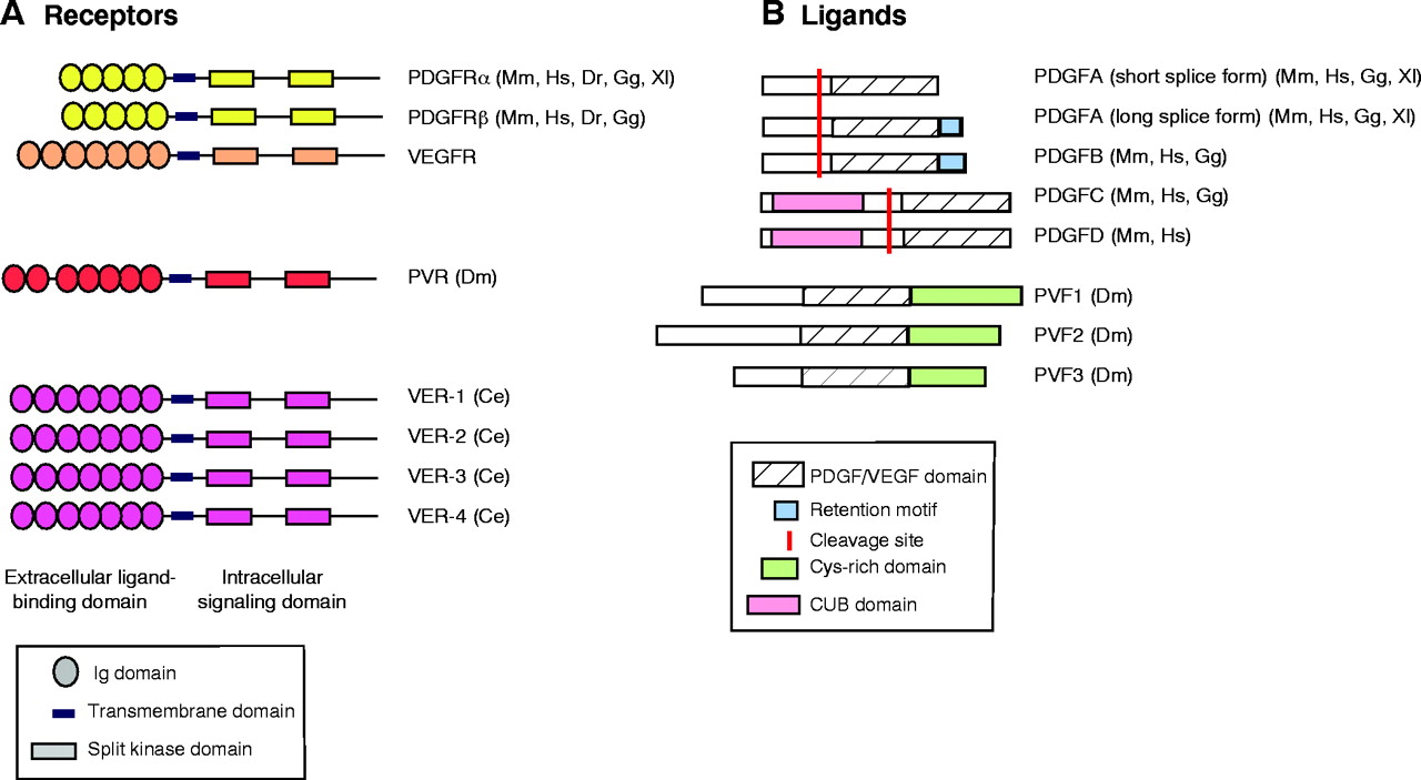 The PDGF/VEGF signaling superfamily. PDGFRs (A), PDGFs (B) and related proteins (A,B) identified in different organisms. Vertebrate VEGFs and VEGFRs are not included in this figure, but a prototypical mammalian VEGFR is shown for comparison (A). Mouse, human, Drosophila and C. elegans proteins are discussed in the text (see text for references). In some teleosts, including zebrafish and pufferfish, the Pdgfrb genomic locus appears to have been duplicated, giving these species three PDGF receptors, PDGFRα, PDGFRβ1.1, and PDGFRβ1.2 (Williams et al., 2002). There are three known splice variants of chick PDGFA, which correspond to the short and long forms identified in mouse, as well as an additional short form (Ataliotis, 2000; Hamada et al., 2000; Horiuchi et al., 2001). Only one receptor (PDGFRα) and two splice variants of PDGFA have been identified in Xenopus (Mercola et al., 1988; Bejcek et al., 1990; Jones et al., 1993). C. elegans and Drosophila melanogaster each have a single PDGF/VEGF-like signaling network. C. elegans has four VEGFR-like proteins, VER-1 to VER-4, but no definitive VER ligand has been identified or characterized. Drosophila has three PDGF/VEGF ligands, PVF-1, 2 and 3, and one receptor, PVR. Two splice forms of PVF-1 have been identified that differ at their N termini. Three splice variants of PVR have also been identified: two differ in the region between the second and third immunoglobulin (Ig) domains, and the third is truncated after the second Ig domain. Mm, Mus musculus (mouse); Hs, Homo sapiens (human); Dr, Danio rerio (zebrafish); Gg, Gallus gallus (chick); Xl, Xenopus laevis (frog); Dm, Drosophila melanogaster (fruit fly); Ce, Caenorhabditis elegans (nematode).