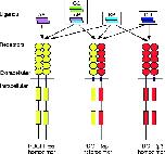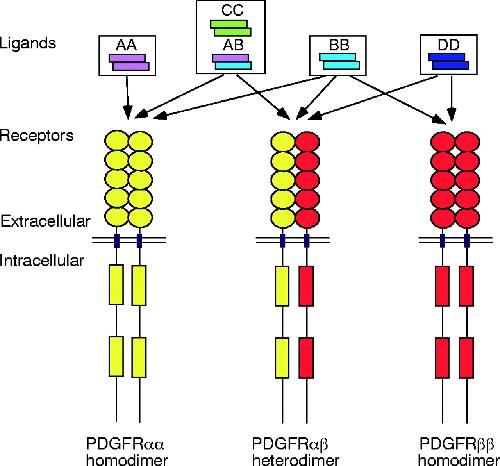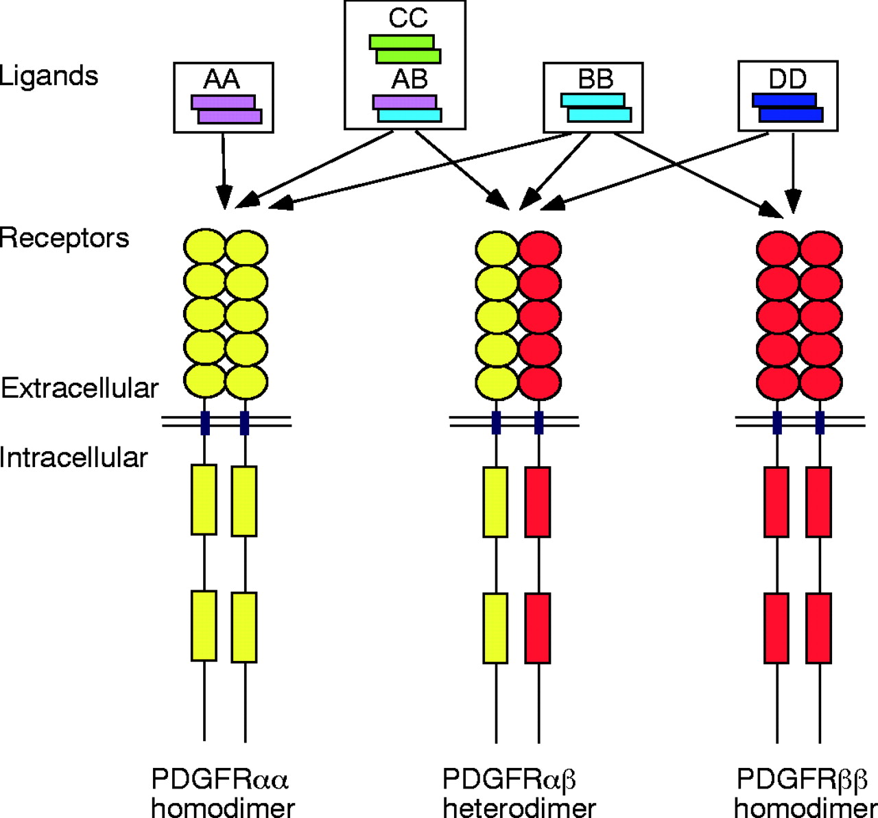 Mammalian PDGF/PDGFR binding interactions. The ability of different homo- and heterodimeric PDGF ligands to bind the different receptor dimers in vitro is shown. Arrows between ligands and receptors indicate the ability of a given ligand dimer to bind to and activate the designated receptor. PDGF dimers are represented by the letters of their constituent subunits, for example, AA is a PDGFA homodimer, and AB is a heterodimer of PDGFA and PDGFB.