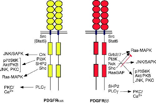 Signal transduction downstream of activated PDGFRs. Upon ligand binding, PDGFRs dimerize, activate intracellular tyrosine kinase domains, and autophosphorylate several tyrosine residues to generate docking sites for signaling and adaptor proteins. Proteins that interact with activated (ligand-bound) mammalian PDGFRα and PDGFRβ homodimers are shown. Also indicated are the signaling pathways activated by the receptor-binding proteins (reviewed by Heldin and Westermark, 1999). Stat5, Signal transducer and activator of transcription 5; PI3K, phosphatidylinositol 3-kinase; SHP2, SH2-containing protein tyrosine phosphatase; PLCγ, phospholipase Cγ; JNK, Jun N-terminal kinase; SAPK, stress activated protein kinase; p70S6K, p70 S6 kinase; PKB, protein kinase B; PKC, protein kinase C; MAPK, mitogen activated protein kinase; RasGAP, Ras GTPase-activating protein.