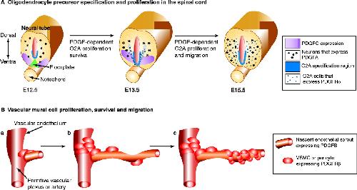 Roles of PDGF in the developing nervous and circulatory systems. (A) Oligodendrocyte precursor cell development in the mouse spinal cord. Oligodendrocyte precursor (O2A) cells, which express PDGFRα, arise in the ventral periventricular zone of the mouse embryonic neural tube around E12.5. From E12.5-E15.5, O2A cells proliferate and migrate laterally and dorsally to fill the spinal cord. During this time, PDGFA is expressed by neurons and astrocytes in the spinal cord, and PDGFC is expressed by cells in the floor plate and ventral horn regions. There is evidence that PDGFA/PDGFRα signaling drives O2A cell proliferation in the spinal cord (E12.5-E15.5). PDGFRα signaling may also influence the migration of O2A cells. The general migration route taken by O2A progenitors is depicted by gray arrows. (B) Vascular mural cell proliferation and migration in the mouse. During angiogenesis, primitive vascular networks (or plexa) are remodeled through branching, sprouting, and pruning of the vascular endothelium. As new vessels form, they recruit and are coated by mural cells, contractile cells that support and stabilize new vessels. The two major classes of vascular mural cells are pericytes, which form single cell layers around capillaries, and vascular smooth muscle cells (VSMCs), which coat veins and arteries. During angiogenic remodeling, PDGFB is expressed in nascent vascular endothelial sprouts (a) and drives the proliferation of PDGFRβ-expressing pericytes and VSMCs near arterial walls and primitive vascular plexa (b). PDGFB also directs the migration and/or survival of these mural cells along endothelial sprouts (b,c). Upon reaching their destination, VSMCs and pericytes encircle and associate tightly with the endothelium (c); survival and anti-proliferative factors produced by mural cells stabilize nascent vessels.