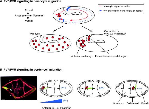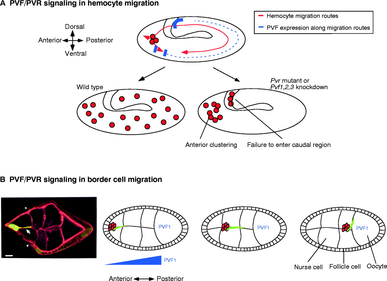 PVF/PVR signals direct cell migration during Drosophila development. (A) Hemocyte migration. Hemocytes (red) originate as bilateral clusters in the anterior region of Drosophila embryos. These cells migrate anteriorly, posteriorly and ventrally to populate the wild-type embryo (red arrows indicate migration routes). PVF ligands are expressed along the embryonic hemocyte migration routes and guide or enable hemocyte migration: in Pvr mutant or Pvf1, 2, 3 knockdown embryos, hemocytes cluster in the head region and fail to enter the caudal region of the embryo. (B) Border cell cluster migration in response to PVF1. In the left-most panel, a stage 9 Drosophila egg chamber expressing lacZ in border cells is stained with anti-β-galactosidase (green; border cells) and phalloidin (red; actin), and shows a long cellular extension (LCE; white arrow), which protrudes from one cell of the border cell cluster toward the oocyte. PVF1 is expressed by oocytes in Drosophila egg chambers, and PVR is expressed by all follicle cells, including the border cell cluster (red, green). In response to a graded PVF1 signal (blue), one border cell of the cluster protrudes a long cellular extension (LCE, green) toward the source of PVF1. This LCE guides the migration of the border cell cluster from the anterior cortex of the egg chamber to its final posterior location next to the oocyte. The panel on the left is copied with permission from Fulga and Rørth (Fulga and Rørth, 2002). Scale bar: 20 μm.