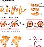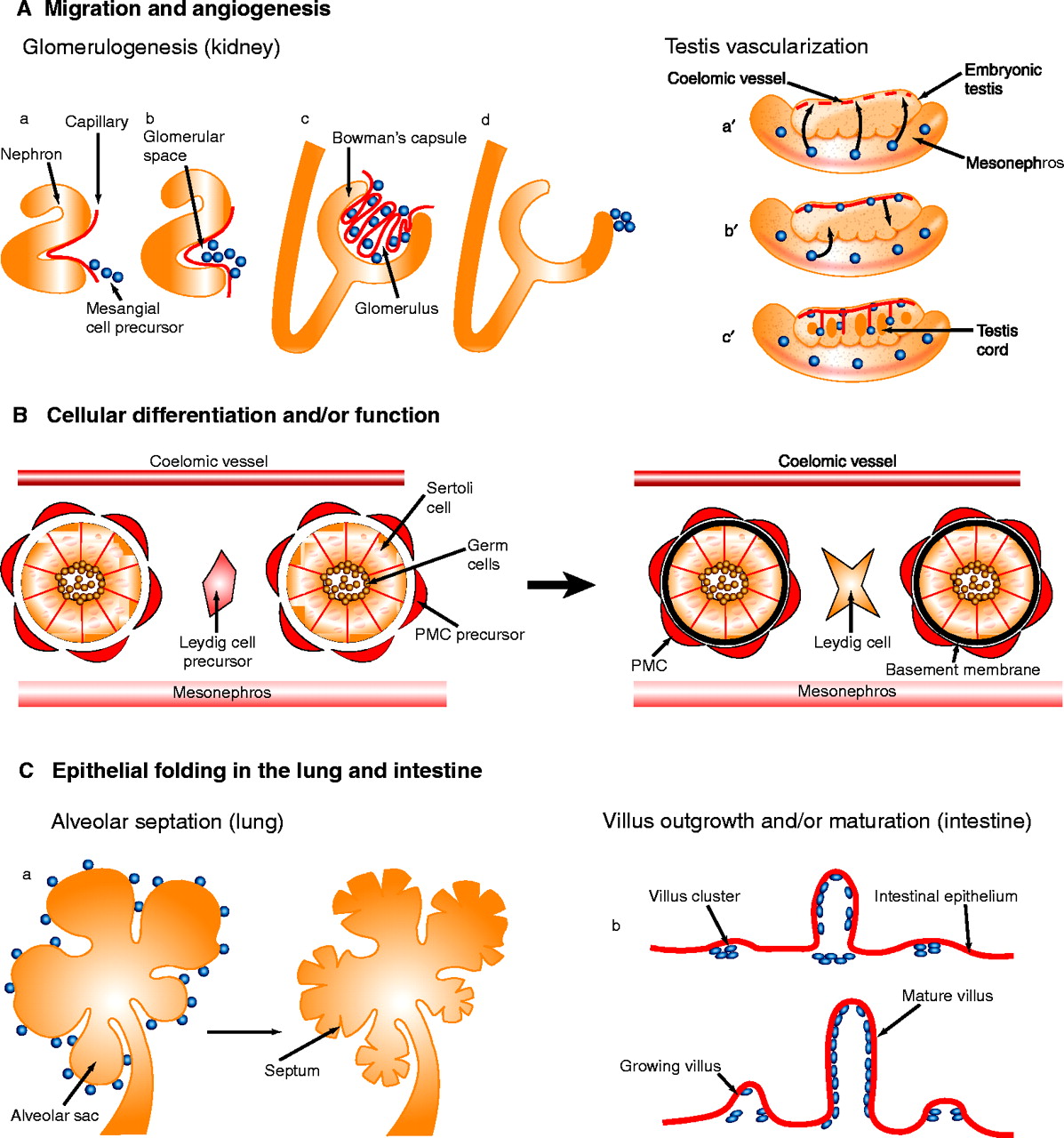 PDGF roles in mammalian organogenesis. In several early developmental contexts, epithelial PDGF drives proliferation of undifferentiated mesenchyme expressing PDGFRα. However, during organ maturation, PDGF signals direct several other cellular functions. (See text for more details.) (A) Cell migration and angiogenesis. In the developing kidney, PDGFB/PDGFRβ signaling is essential for the migration of Pdgfrb-expressing endothelial/mesangial cell precursors (blue) from (a) the cleft of the S-shaped nephron into (b,c) the glomerular space. These cells give rise to the glomerular capillary bed (red) and its mesangial cells (pericyte-like cells that coat glomerular capillaries; c). (d) In Pdgfb- and Pdgfrb-null embryos, few Pdgfrb-expressing precursors migrate to the nephron cleft, and these cells fail to enter the glomerular space; capillary beds fail to form in these embryos and capillary aneurysms are observed in the glomerular space. The embryonic testis vasculature develops through the formation of the coelomic vessel (aâ², bâ²) and the branching of this vessel between testis cords (câ²). Endothelial cells (blue) migrate from the mesonephros into the testis, where they contribute to the coelomic vessel and its branches (red). PDGFRα is required for both endothelial cell migration and branching of the coelomic vessel. In both the kidney and testis, PDGF signals may directly induce angiogenic branching of the primitive vasculature, although this has not been clearly shown in vivo. (B) Cellular differentiation and/or function. PDGF signals are essential for the differentiation and/or function of interstitial cell types in the developing testis. PDGFRα is required for the differentiation of both fetal and adult Leydig cells. The ligand(s) required for fetal Leydig cell development are not yet known, but PDGFA is required for the development of adult Leydig cells, which replace fetal Leydig cells during postnatal testis maturation. There is evidence from in vitro studies that PDGF signals may induce perimyoid cell (PMC) differentiation and/or function. These cells originate in the interstitium and differentiate into contractile, smooth muscle-like cells that associate tightly with testis cords. Together, PMCs and Sertoli cells produce the basement membrane around cords. The source(s) of PDGFs that direct interstitial cell differentiation/function is not clear, although PDGFs are secreted from the coelomic vessel, the mesonephros and testis cords. (C) Epithelial folding. Pdgfra-expressing mesenchymal cells cluster at sites of future epithelial folding during lung, skin and intestine morphogenesis. Although the Pdgfra-expressing cells are essential for these morphogenetic processes, their roles and the role(s) of PDGF signaling in folding morphogenesis are not yet known. Late in embryogenesis, Pdgfra-positive mesenchymal cells (blue) in the lung migrate to sites of alveolar septation (a), a postnatal process in which the air sac epithelium invaginates and is lined with specialized matrix. Septation does not occur in the absence of the Pdgfra-positive cells, whose development requires PDGFA during embryogenesis. During intestine maturation, Pdgfra-positive mesenchymal cells (blue) cluster at sites of future villus formation (b). The intestinal epithelium subsequently folds into the lumen of the intestine and Pdgfra-positive cells migrate from the clusters to line the forming villus. Pdgfra expression is maintained in these cells during villus maturation, and, in PDGFA-null mice, villus structure and epithelial differentiation are abnormal.