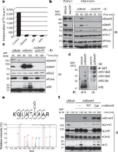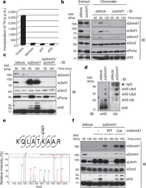 Figure 1: xUhrf1- and DNA-replication-dependent DNA methylation and ubiquitylation of H3 at lysine 23 in Xenopus egg extracts. a, Sperm chromatin was incubated with interphase egg extracts containing radiolabelled S-[methyl-3H]-adenosyl-L-methionine. His6–geminin, glutathione S-transferase–p27 or aphidicolin (APD, 150 µM) was added to the extracts 10 min before the addition of sperm DNA. After 1 h, sperm DNA was purified from the egg extracts and the incorporation of radioactivity was measured using a scintillation counter. Data shown are representative of three independent experiments. b, Interphase egg extracts immunodepleted (ID) with the indicated antiserum were incubated with sperm nuclei. Extracts and sperm chromatin isolated at the indicated times were analysed by immunoblotting (IB) using the indicated antibodies. c, Chromatin fractions from interphase extracts immunodepleted with the indicated antibodies were isolated at the indicated times after sperm addition and analysed by immunoblotting. d, Chromatin fractions from the indicated immunodepleted extracts were solubilized by MNase and immunoprecipitated with anti-H3 antibodies after treatment with 1% SDS. The resultant immunoprecipitates were subjected to immunoblotting using the indicated antibodies. e, The electron transfer dissociation MS/MS spectrum of the xH3 peptide shows ubiquitylation at lysine 23. Detailed information is provided in Methods. f, Buffer alone (−), recombinant His8-tagged wild-type (WT) rmDnmt1, or its catalytic mutant (cat) proteins (10 ng μl−1) were added to xDnmt1-depleted extracts. Chromatin fractions isolated at the indicated times were subjected to immunoblotting using the indicated antibodies.