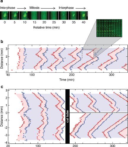 Figure 2. Rapid, linear propagation of mitotic entry and exit through Xenopus cytoplasma, An example of nuclear envelope breakdown and nuclear envelope reformation in an extract with added sperm chromatin and GFP-NLS. b, The timing of mitotic entrance and exit in a 3 mm section of a Teflon tube submerged in mineral oil. Each data point represents the time and position at which an individual nucleus underwent nuclear envelope breakdown (red points) or nuclear envelope re-formation (blue points). The pink and blue regions of the plot denote mitosis and interphase, respectively. Time is measured relative to when the extract was warmed to room temperature. The inset shows frames from the video in montage form. c, Trigger waves vs. phase waves. The tube was cut under mineral oil at 160 min. See also Supplementary Fig. 2.
