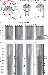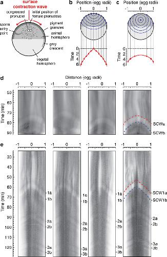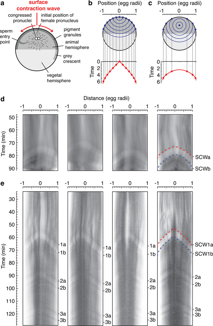 Figure 4. Surface contraction waves in intact Xenopus eggsa, Schematic view of the anatomy of a fertilized egg just before the onset of mitosis. Adapted from ref. 27. b, c, Expected propagation of surface contraction waves if they were due to a spherical wave of Cdk1 activation spreading from a point source. An equation for the spreading of the waves (Eq S1) is derived in the Supplementary Materials. Panel B assumes the point source is at the animal pole. Panel C assumes the point source is halfway between the animal pole and the center of the cell. d–e, Kymographs depicting surface contraction waves, indicated by transitions from light to dark or dark to light, in four fertilized eggs (d) and four parthenogenetically-activated eggs (e). The red and blue dashed curves are fits of the experimental data to the Eq S1. See also Supplementary Fig. 4.