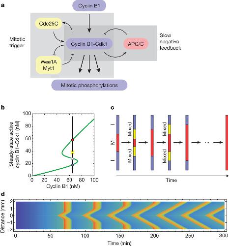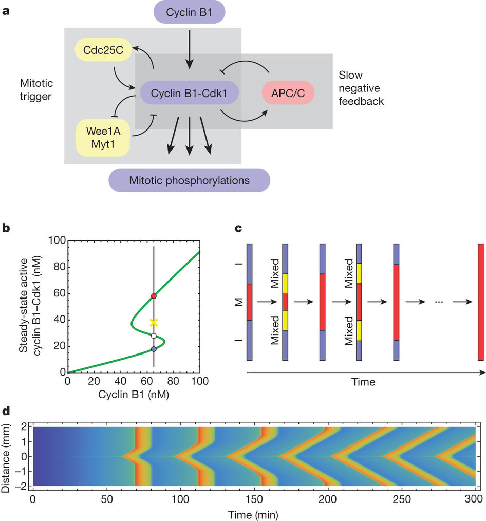 Figure 1: Trigger waves in Cdk1 activation. a, Schematic view of the Cdk1–APC/C circuit. b, Modelled steady-state response of Cdk1 to cyclin B1, with parameters on the basis of experimental studies25, 26. At intermediate concentrations of cyclin, the response is bistable. The stable low (interphase) and high (mitotic) Cdk1 activity steady-states corresponding to one such cyclin concentration (65 nM) are shown as blue and red circles, respectively. The white circle denotes the unstable steady state, and the yellow X denotes an intermediate level of Cdk1 activity that would be attracted to the mitotic (red) steady state. c, Schematic view of the propagation of Cdk1 activity up and down a one-dimensional tube through successive rounds of mixing and conversion. I, interphase; M, mitosis. d, Modelled propagation of Cdk1 activity in a one-dimensional tube. It is assumed that cyclin B1 is synthesized at a uniform rate everywhere in the tube, but in a 5 µm region in the middle of the tube the concentration of Cdc25C is 50% higher than in the rest of the tube, allowing Cdk1 to become activated earlier. Cyclin B1–Cdk1 activity is denoted by the colour scale (blue is low, red is high). Numerical solution of the partial differential equations used Mathematica 9.0 (Wolfram) as described in the Supplementary Materials. See also Supplementary Fig. 1.