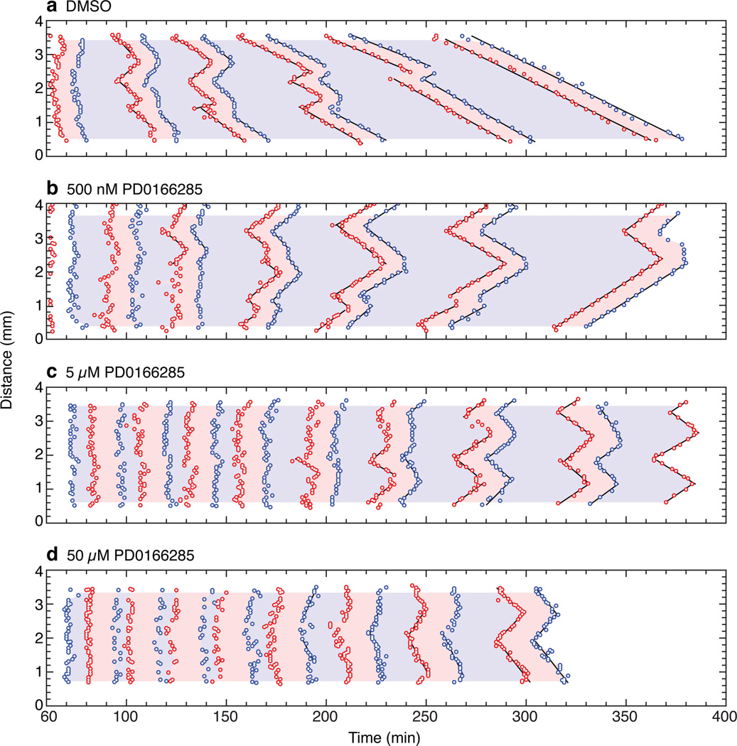 Figure 3. The Wee1/Myt1 inhibitor PD0166285 accelerates the trigger wavesa–d, Mitotic entrance and exit waves in extracts treated with DMSO or one of three concentrations of PD0166285. See also Supplementary Fig. 3.