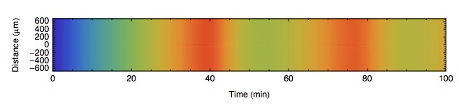 Supplementary Figure 1 | Cdk1 activation as a function of time and position in a one-dimensional tube, assuming that there is no bistable trigger in the oscillator circuit. As was the case in Fig. 1d, it was assumed that cyclin B1 is synthesized at a uniform rate everywhere in the tube, but in a 5 µm region in the middle of the tube the concentration of Cdc25C is 50% higher than in the rest of the tube, allowing Cdk1 to become activated earlier. Cyclin B1-Cdk1 activity is denoted by the color scale (blue is low, red is high). Numerical solution of the PDEs was carried out using Mathematica 9.0 (Wolfram). Note that the peak of Cdk1 activity is lower here than in the cycles shown in Fig. 1d, so the heat map scale was adjusted to make it easier to perceive the oscillations here.