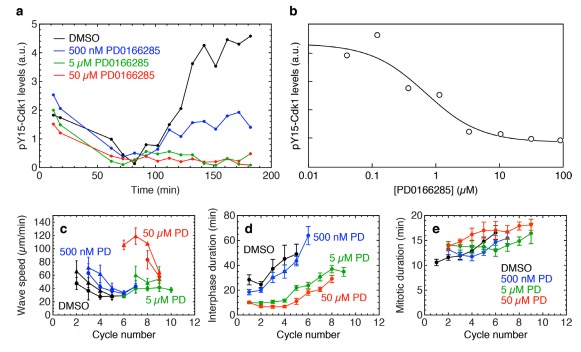 Supplementary Figure 3 | Effects of PD0166285 on Cdk1 Y15 phosphorylation and mitotic waves. a, Time course of Cdk1 Y15 phosphorylation. b, Dose/response data. Extracts were incubated with 1 mM sodium orthovanadate to inhibit Cdc25C. After 39 min, non-degradable Δ65-cyclin B1 and various concentrations of PD0166285 were added. Samples were taken at 69 min for pY15 immunoblotting. In panels A and B, pY15-Cdk1 signal was quantified with a LICOR Odyssey Imager. The IC50 was estimated to be 0.74 µM. c-e, Effects of PD0166285 on wave speed (c), interphase duration (d), and mitotic duration (e) in various cycles. In panel C the circles correspond to mitotic entrance and the triangles to mitotic exit. Interphase and M-phase duration were calculated from the data in Fig. 3 by defining polygonal interphase and M-phase regions by linear interpolation (the pink and blue regions in Fig. 3), dividing these regions into 10 equal-length segments, and calculating the area divided by the height for each region. Durations are expressed as means ± S.D.