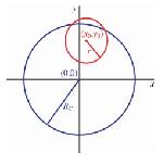 of Cdk1 activation would arrive at the cell cortex. The blue circle represents an egg of radius Rc. The red circle represents a spherical trigger wave that originated at a position (x0,y0) and has a radius r = v t − t ( 0 ).