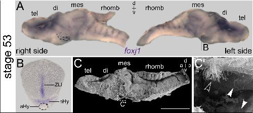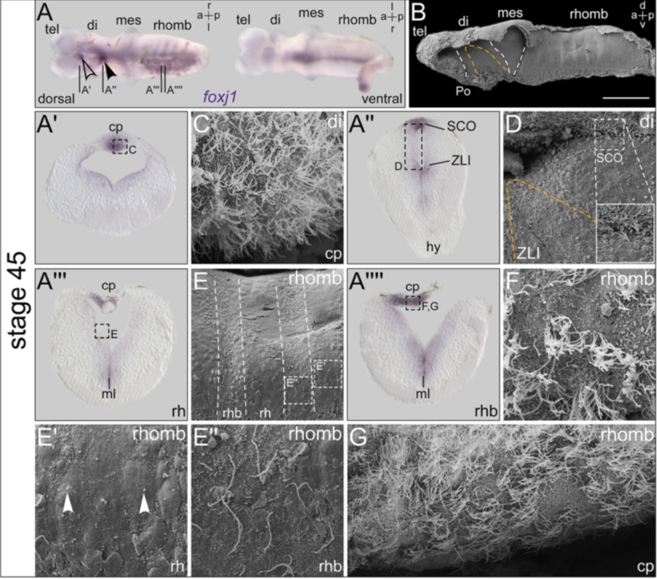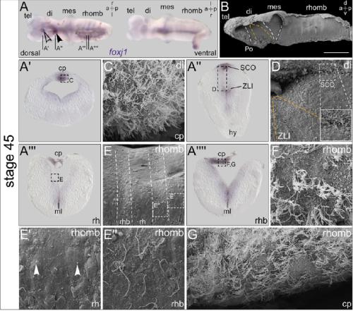 Figure 3. Additional foxj1 expression domains identify regions with emerging ciliation. In situ hybridization and scanning electron microscopy (SEM) on explanted brains at stage 45. (A) Explant shown in dorsal (d) and ventral (v) view. Expression in the ventral midline, rhombomere boundaries, subcommissural organ (SCO, arrowhead), and the choroid plexus (cp; outlined arrowhead). (B) SEM picture of brain explant dissected sagittally with view onto the ventricular surface, the zona limitans intrathalamica (ZLI) is delimited with orange dashed line and boundaries between brain regions are indicated by white dashed lines. Bar represents 200 ?m. (A?-A??) Transversal histological sections as indicated in (A), dorsal side up, and SEM pictures (C-G) of corresponding regions as indicated in the sections, respectively. (C) MCCs on cp invaginating from the diencephalon roof. (D) Close-up view onto the ZLI region; enlargement showing ciliated structure of the SCO. (E) Close-up view revealing metamerical organization of the rhombencephalon (rhomb). Rhombomeres (rh) and rh boundaries (rhb) indicated by dashed lines. (E?) Enlargement of the rh region; arrowheads pointing to short primary cilia. (E?) Enlargement of the rhb with cells bearing elongated monocilia. (F, G) Close-up views onto the fourth ventricle cp showing MCCs. a = anterior; di = diencephalon; hy = hypophysis; l = left; mes = mesencephalon; ml = midline; p = posterior; Po = preoptic region; r = right; tel = telencephalon.