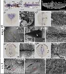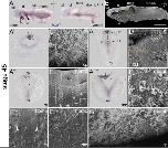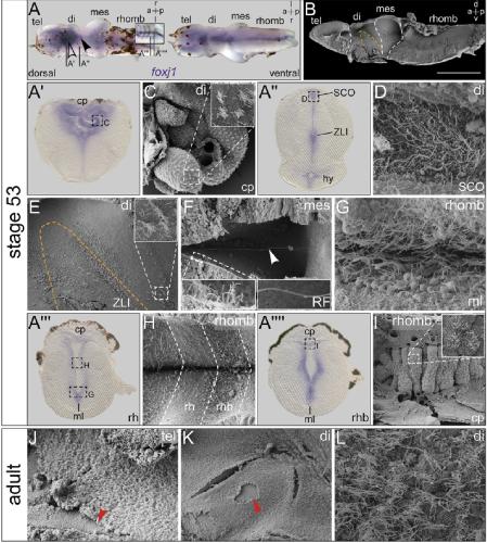 Figure 4. Continued foxj1 expression and ciliogenesis in the premetamorphic and adult brain of Xenopus. In situ hybridization and scanning electron microscopy (SEM) on explanted brains at stage 53 and SEM on adult brains. (A) Explant shown in dorsal (d) and ventral (v) view. Expression in the ventral midline, subcommissural organ (SCO, arrowhead), choroid plexus (cp; outlined arrowhead), and ventricular regions. Inset in (A) focuses on expression in rhombomere boundaries (rhb) after removal of the pigmented rhombencephalon (rhomb) roof. (B) SEM picture of brain explant dissected sagittally with view onto the ventricular surface, the zona limitans intrathalamica (ZLI) is delimited with orange dashed line and boundaries between brain regions are indicated by white dashed lines. Bar represents 500 ?m. (A?-A??) Transversal histological sections as indicated in (A), dorsal side up. (C-I) SEM pictures corresponding to regions indicated in (A?-A??), respectively. (C) Close-up view of third ventricle cp; inset showing enlarged view of MCCs. (D) Top view onto ventricular surface of SCO of a frontally bisected specimen. (E) Overview of the diencephalon (di) region; inset showing MCCs emerging at the di-/mesencephalic boundary, similar to those of the ZLI. (F-I) Frontally bisected specimens. (F) View into the dorsal ventricular lumen of the mesencephalon (mes) with Reissner?s fiber (RF, arrowhead) spanning the ventricle. Left inset: enlargement of mes MCCs. Right inset: enlargement of RF. (G) View onto the ventral midline (ml). (H) Ventral part of the rhomb with rhombomeres (rh) and rhb as indicated. (I) cp of the rhomb roof with MCCs. (J-L) SEM pictures of sagittally bisected adult brain in the telencephalon (tel; (J)) and di region (K, L) showing a multiciliated ependymal monolayer. Arrows indicate sites of ependyma detachment due to mechanical stress during processing. a = anterior; hy = hypophysis; l = left; p = posterior; r = right.