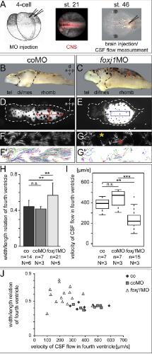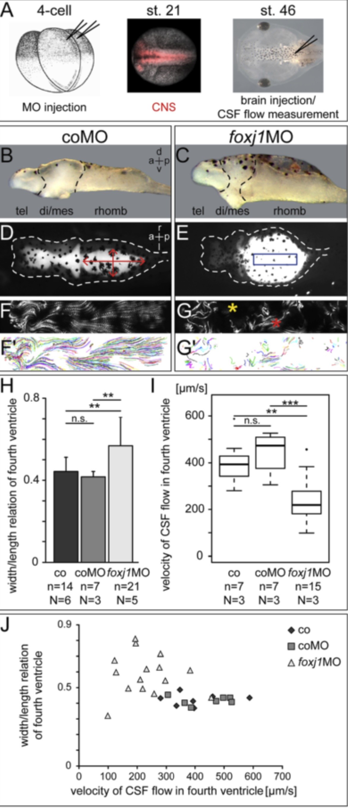 Figure 5. Loss of function of foxj1 in the central nervous system induces hydrocephalus. (A) Timeline of experimental process. (B, D, F, F?) Control morpholino (coMO) -injected specimen. (C, E, G, G?) foxj1 morpholino (foxj1MO) -injected specimen. (B, C) Brain explants of stage 46 tadpoles, side view. (D, E) Dorsal (d) view of tadpole heads at stage 46; ventricular system visualized by injection of a fluorescent dye. Note the obstruction of the ventricular system and the hydrocephalic hindbrainventricle in foxj1MO -injected embryos in (E). (F, G) Z-projection of video-tracked fluorescent beads. (F?, G?) Display of statistically analyzed bead trajectories. (H) Statistical analysis of fourth ventricle width to length relation, measured as indicated in (D). 0 = linear ventricle, 1 = perfect circle; error bars represent SD. (I) Statistical analysis of CSF flow velocity in the fourth ventricle. Region of interest chosen for flow measurement as indicated by blue box in (E). (J) Correlation of statistical analyses in (H) and (I). a = anterior; CNS = central nervous system; co = control; CSF = cerebrospinal fluid; di = diencephalon; l = left; mes = mesencephalon; n = number of specimens; N = number of experiments; p = posterior; r = right, rhomb = rhombencephalon; tel = telencephalon; v = ventral.