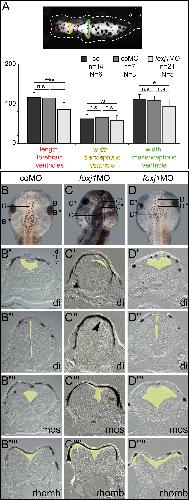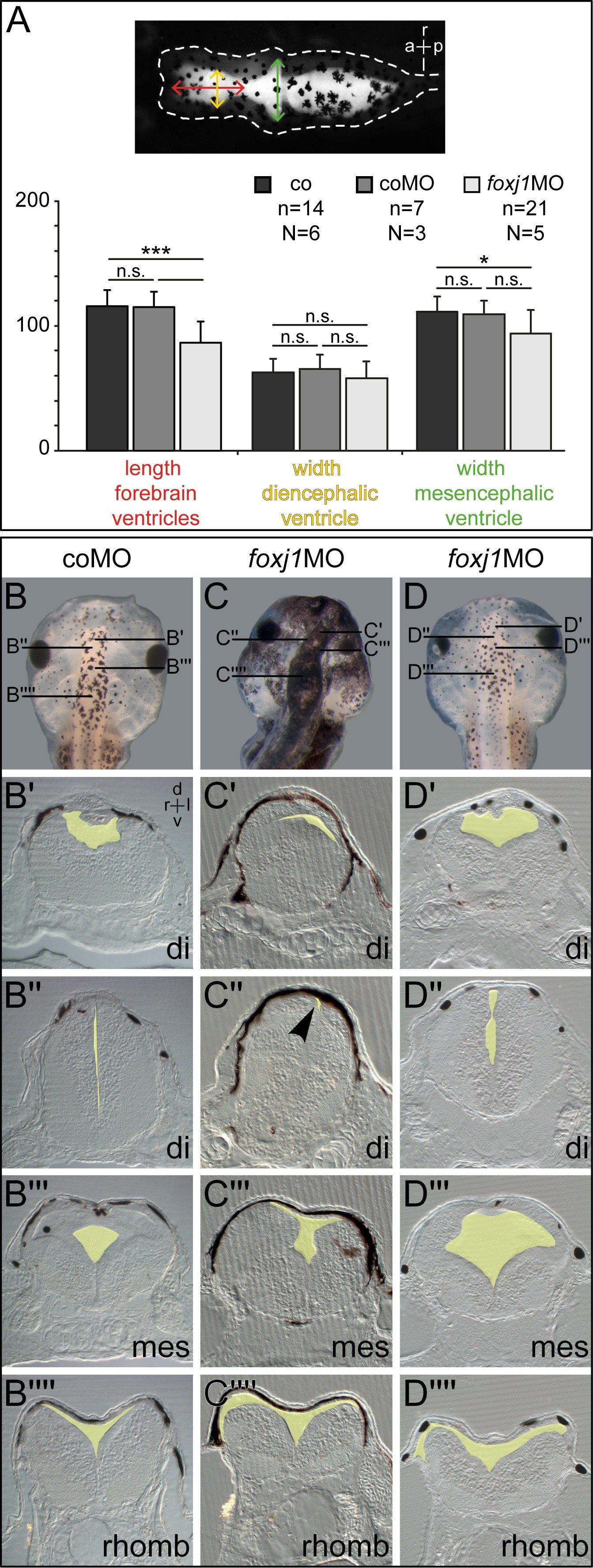 (B-D) Dorsal view of coMO (B) and foxj1MO (C, D) -injected specimens. (B'-D"") Transversal sections as indicated in (B-D) with ventricular lumen highlighted in yellow. a = anterior; co = control; di = diencephalon; l = left; mes = mesencephalon; n = number of specimens; N = number of experiments; p = posterior; r = right, rhomb = rhombencephalon.