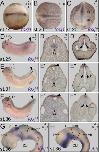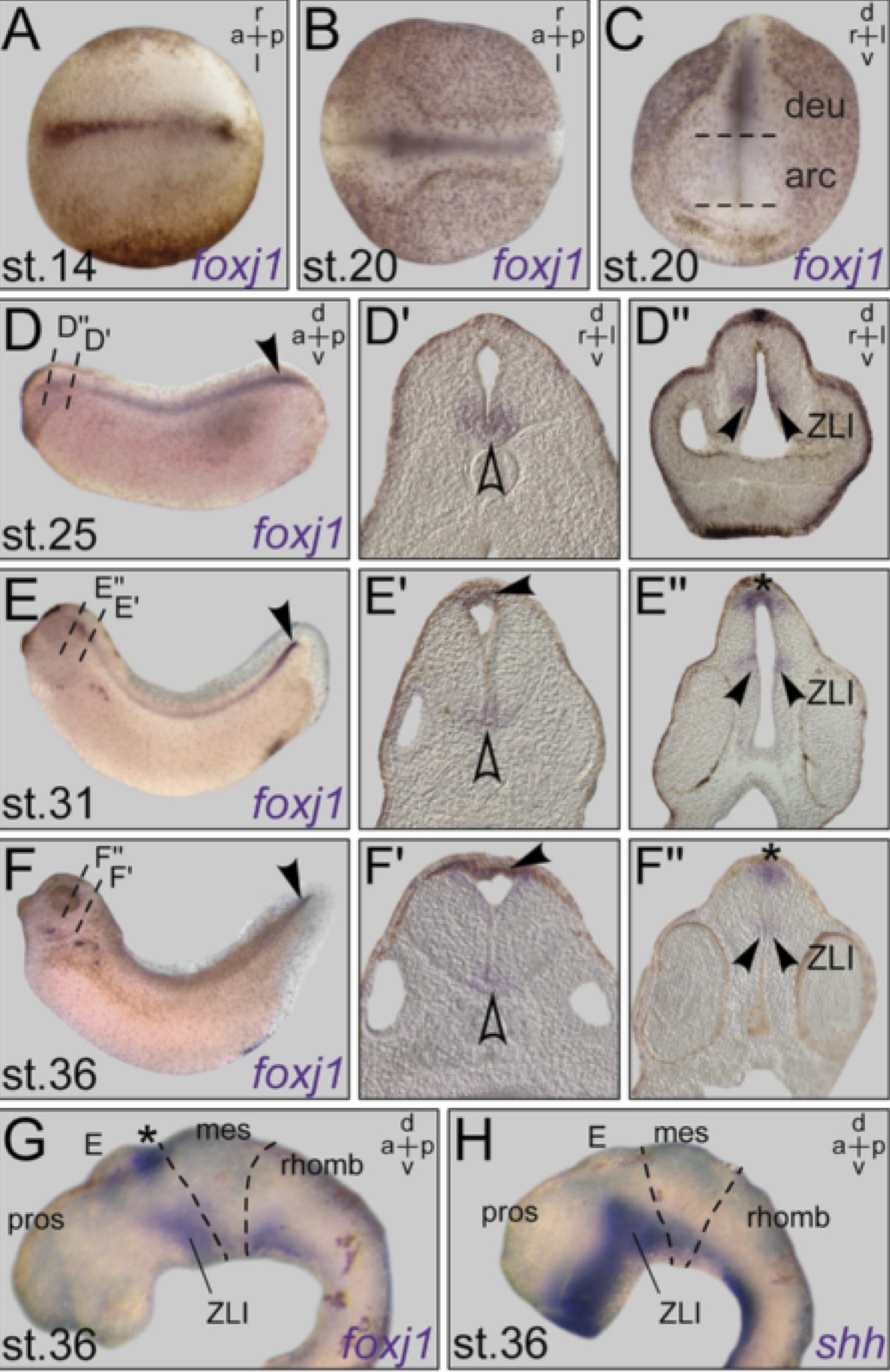 Figure 1. Xenopus tadpoles express foxj1 in distinct regions of the developing CNS. Whole-mount in situ hybridization of staged embryos and explanted brains. (A) Expression at early neurula stage (dorsal (d) view). (B, C) Expression at late neurula stage in epidermis and floor plate, in dorsal (B) and frontal view (C). (D) Staining in the floor plate at stage 25. Note the higher expression level at the ampulla terminalis (arrowhead). (D?, D?) Transversal sections, levels indicated in (D), revealed staining in the ventral (v) midline (outlined arrowhead) (D?) and the zona limitans intrathalamica (ZLI; arrowheads) (D?). (E, F) Expression at stage 31 (E) and stage 36 (F) in the nephrostomes, the spinal cord, and the ampulla terminalis (arrowheads). (E?, E?, F?, F?) Histological sections as indicated in (E, F) highlighted expression in the rhombencephalic roof (arrowheads in E?, F?), the ventral midline (outlined arrowheads in E?, F?) as well as in the subcommissural organ (SCO; asterisk in E?, F?, G) and the ZLI (arrowheads in E?, F?). (G, H) Brain explants at stage 36 after in situ hybridization with antisense probes for foxj1(G) and shh(H) in side view showed co-localization of mRNA expression in the ventral midline and the ZLI. a = anterior; arc = archencephalon; deu = deuterencephalon; l = left; mes = mesencephalon; p = posterior; pros = prosencephalon; rhomb = rhombencephalon; r = right; st. = stage.