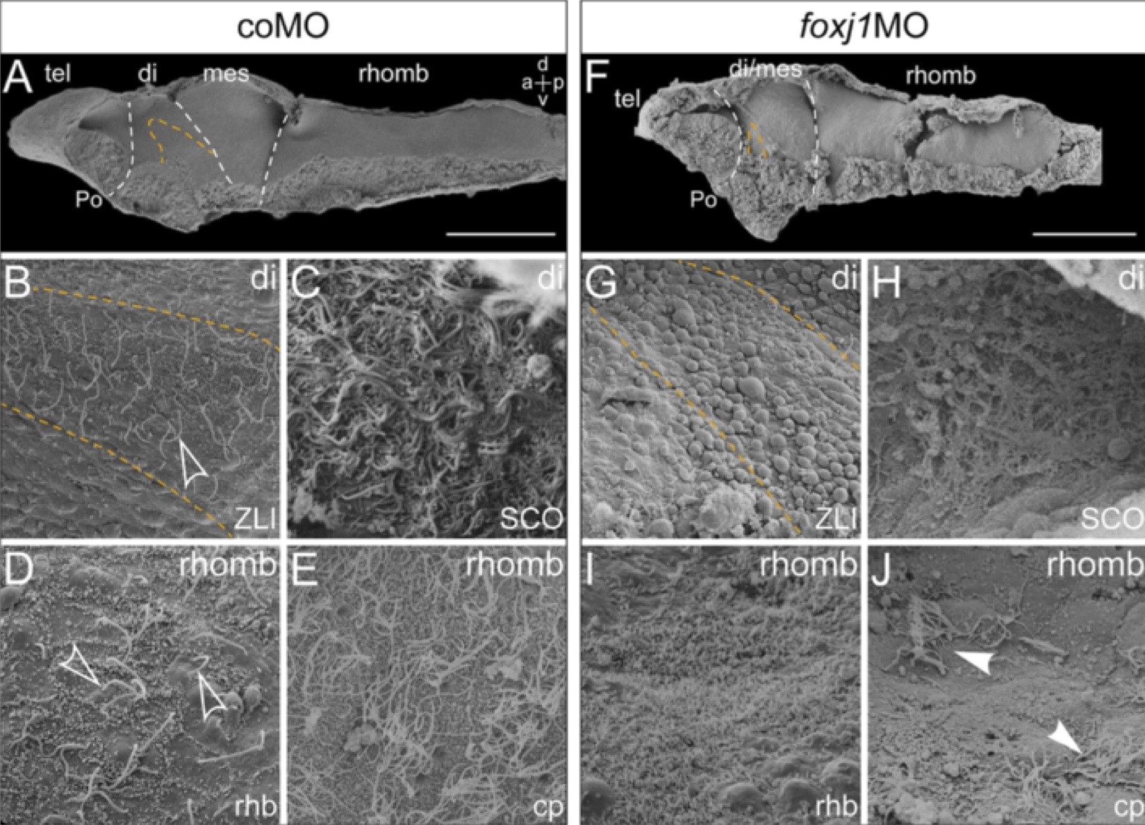 Figure 6. Reduced CSF flow velocity correlates with defects in ciliogenesis. Scanning electron microscopy (SEM) of dissected brain explants at stage 46. (A-E) Control morpholino (coMO) -injected specimen. (F-J)foxj1 morpholino (foxj1MO) -injected specimen. (A,F) SEM pictures of brain explants dissected sagittally with view on the ventricular surface, the zona limitans intrathalamica (ZLI) is delimited with orange dashed line and boundaries between brain regions indicated by white dashed lines. Bars represent 200 ?m. (B,G) View onto the ZLI in the diencephalon (di). Note the loss of cilia on the ZLI in foxj1 morphants (G). (C,H) Close-up views onto the subcommissural organ (SCO) in frontally dissected specimens. (D,I) Close-up views onto the rhombencephalon in sagittally dissected specimens, depicting the rhombomere boundaries. Outlined arrows in (D) point to elongated monocilia. Note the absence of cilia in (I). (E,J) Close-up view onto the choroid plexus (cp) of the hindbrain roof. Arrowheads in (J) point to the few remaining MCCs in foxj1 morphants. a = anterior; d = dorsal; mes = mesencephalon; tel = telencephalon; rhomb = rhombencephalon; Po = preoptic region; p = posterior; rhb = rhombomere boundary; v = ventral.