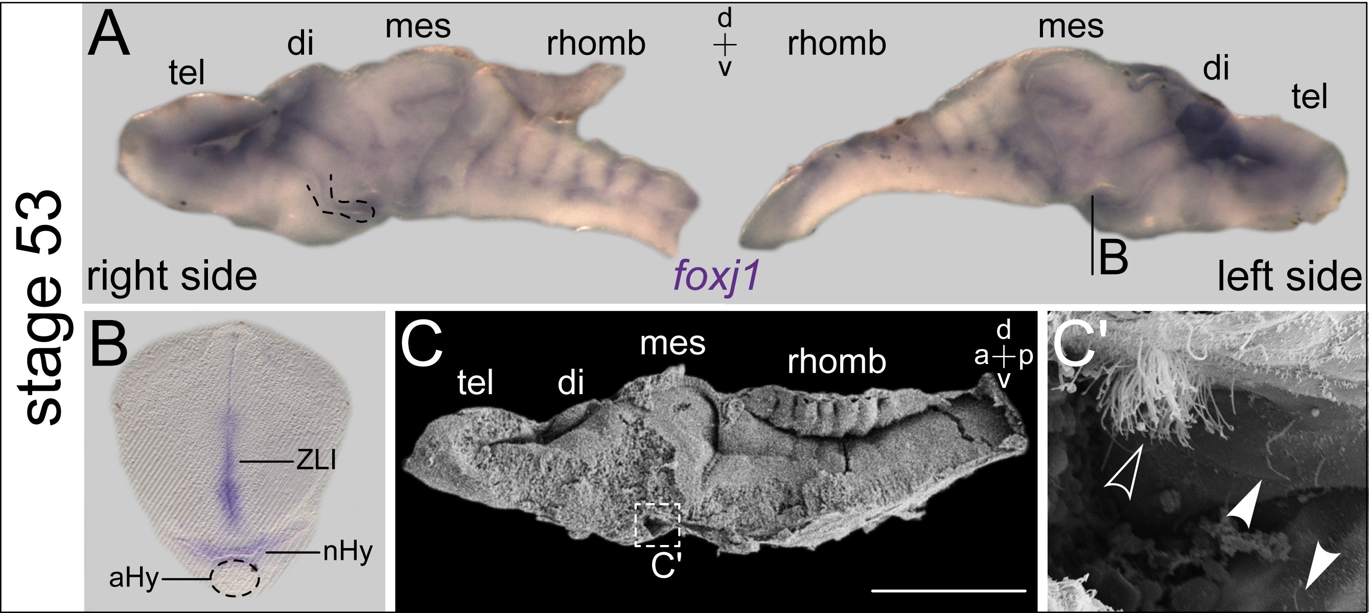 Figure S2. Expression of foxj1 in the infundibular wall correlates with emergence of MCCs. In situ hybridization and scanning electron microscopy (SEM) on explanted brains at stage 53. (A) Right and left hemisphere of brain sectioned sagittally along the midline. The infundibulum is framed by a dashed line. (B) Transversal section, as indicated in (A) reveals expression of foxj1 in the zona limitans intrathalamica (ZLI) and the neurohypophysis (nHy) but not in the adenohypophysis (aHy). (C) SEM picture of brain dissected sagittally. (C') Close-up view onto the infundibular wall with elongated cilia (arrowheads) and one MCC (outlined arrowhead). d = dorsal; di = diencephalon; mes = mesencephalon; rhomb = rhombencephalon; tel = telencephalon; v = ventral.