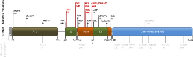 Figure 1. Location of GRIN2B mutations in a schematic illustration of the conserved domains of the NR2B subunit (SP = signal peptide; ATD = amino-terminal domain, involved in receptor assembly; S1 and S2 form the ligand-binding domain; Pore = re-entrant pore-forming and transmembrane spanning domains; PDZ = PDZ domain binding motif). All
