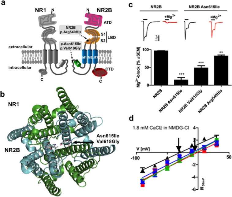 domain, and Asn615 and Val618 in the ion channel pore. N = NH2-terminus; C= COOH-terminus. (B) Model of the transmembrane arrangement of the N-methyl-D-aspartate (NMDA) receptor composed of NR1 (green) and NR2B (cyan) subunits (top view). The arrow highlights the side chains of p.Asn615Ile and p.Val618Gly in the pore-forming region. (C) Gradual loss of Mg2+ inhibition of NR1-NR2B wild-type and