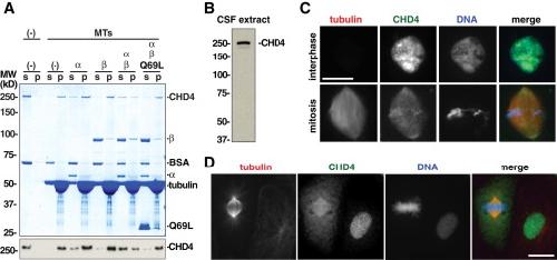 (D) Localization of CHD4 in Xenopus XL177 cells. Cells were stained with CHD4 antibody followed by Alexa 488-labeled anti-rabbit IgG (green). Tubulin was stained with anti-tubulin and Alexa 568-labeled anti-mouse IgG (red).
