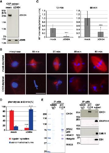 (C) CHD4 staining on spindles is specific. The CHD4 antibody (1 μg/ml) in a blocking buffer containing 20 mg/ml BSA was supplemented with recombinant CHD4 (5 μg/ml) and incubated at RT for 10 min. The solution was used for staining of spindles assembled in control extracts. Note that the antibody did not stain spindles when blocked by recombinant CHD4, showing its specificity.