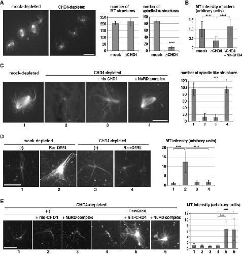 (E) Recombinant CHD4 rescues RanGTP-dependent MT stabilization. The assay shown in (D) was performed in the presence of recombinant CHD4 or the NuRD complex. n > 20 asters. Error bars represent SD. ∗∗∗∗p < 0.0001.