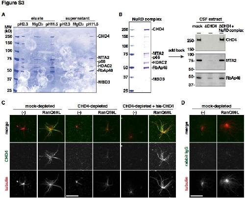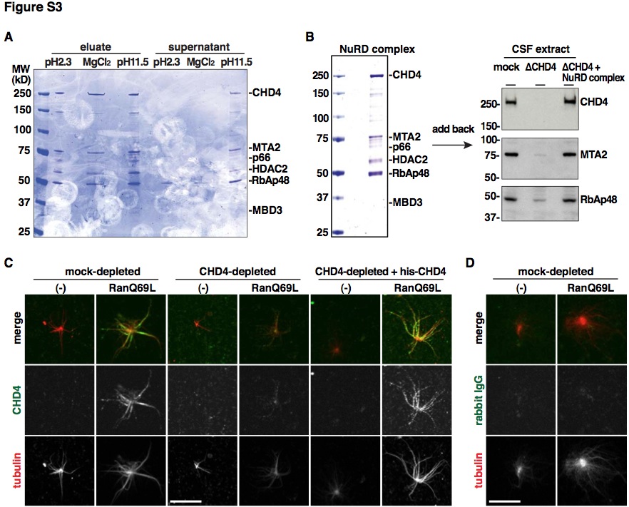 Figure S3. Add back of the NuRD complex to egg extracts and CHD4 localization in centrosomal asters, related to Figure 3 (A) The CHD4 immunoprecipitates (Figure 2E) were eluted from the beads with acid, a high concentration of MgCl2, or alkali. The eulates were dialyzed to a physiological