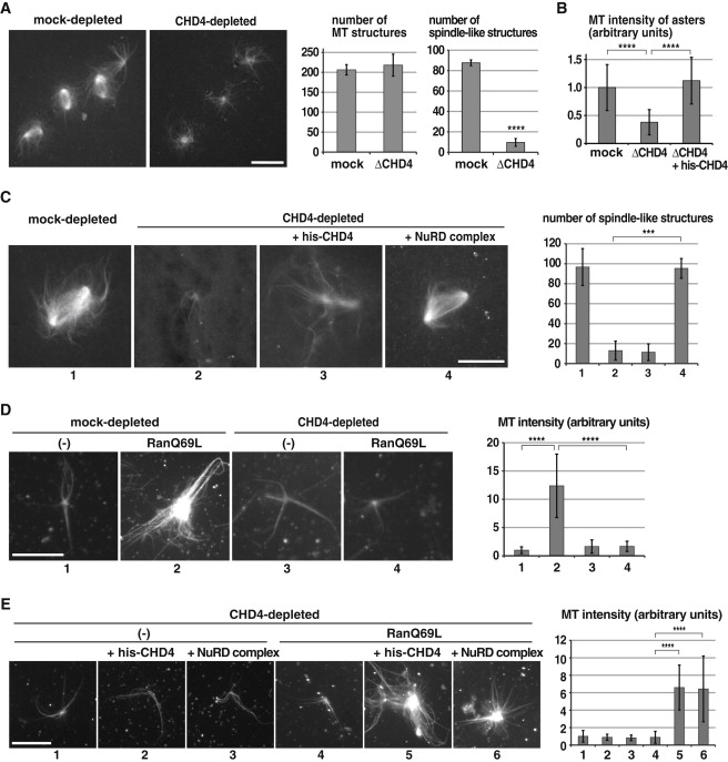 (A) CHD4 depletion does not affect RanGTP-dependent MT nucleation but prevents bipolar spindle formation. Mock and CHD4-depleted CSF extracts were incubated with RanQ69L and Cy3-tubulin at 20°C for 80 min. Numbers of MT structures and spindle-like structures were counted in 100 randomly selected fields with a 63× objective. Error bars represent SD from three independent experiments. ∗∗∗∗p < 0.0001 (Student’s t test, two-tailed).